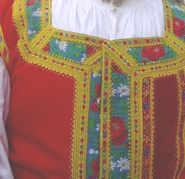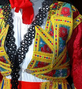 | Il costume, pur essendo molto ricco di colori viene ornato infine con dei gioielli che risultano essere i classici bottoni d'oro posizionati sul collo. | |||||||||||